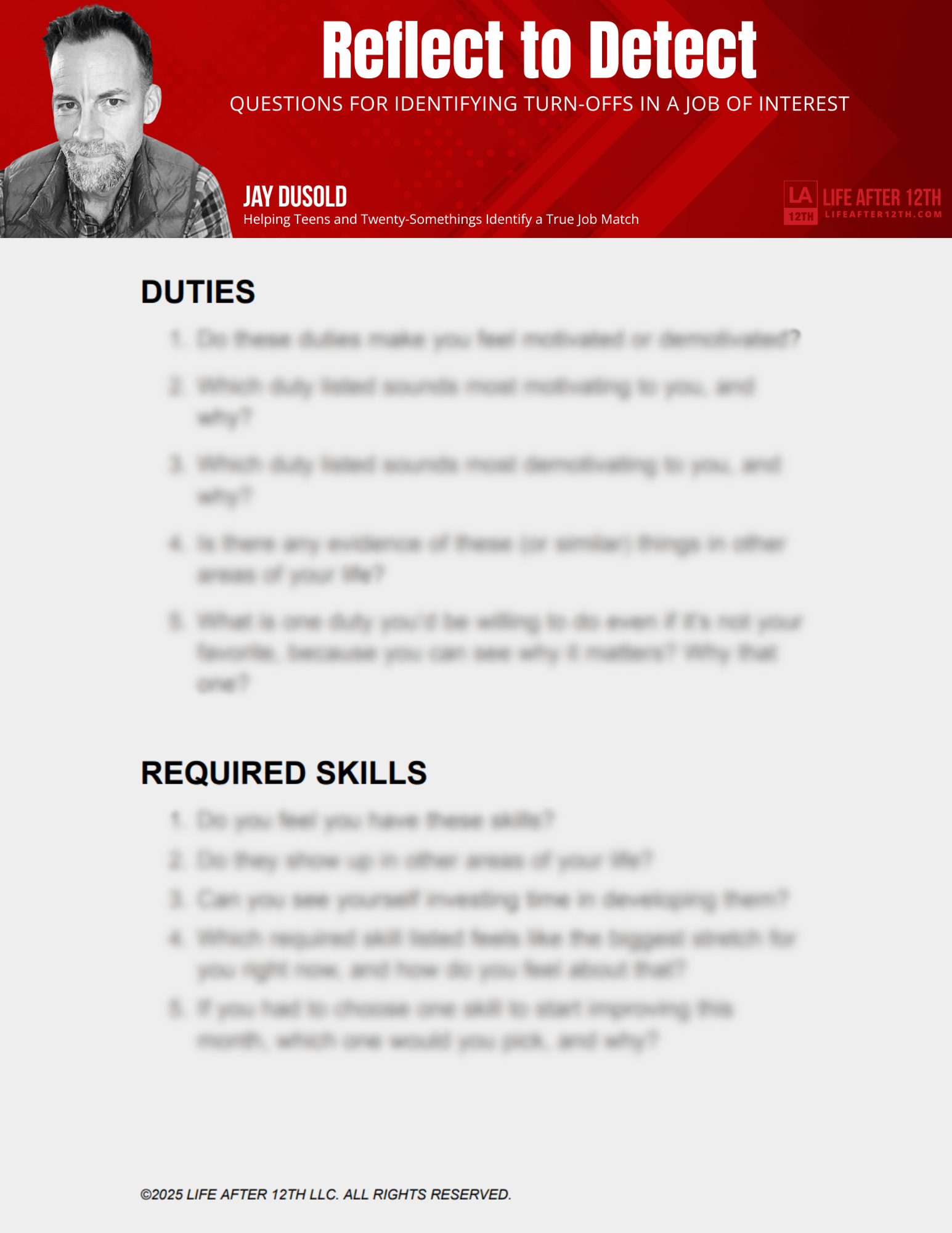 This free LA12 resource provides forty-five questions your teen or twenty-something can use to reflect on the discoveries they made about a job using the Job Research Blueprint™.